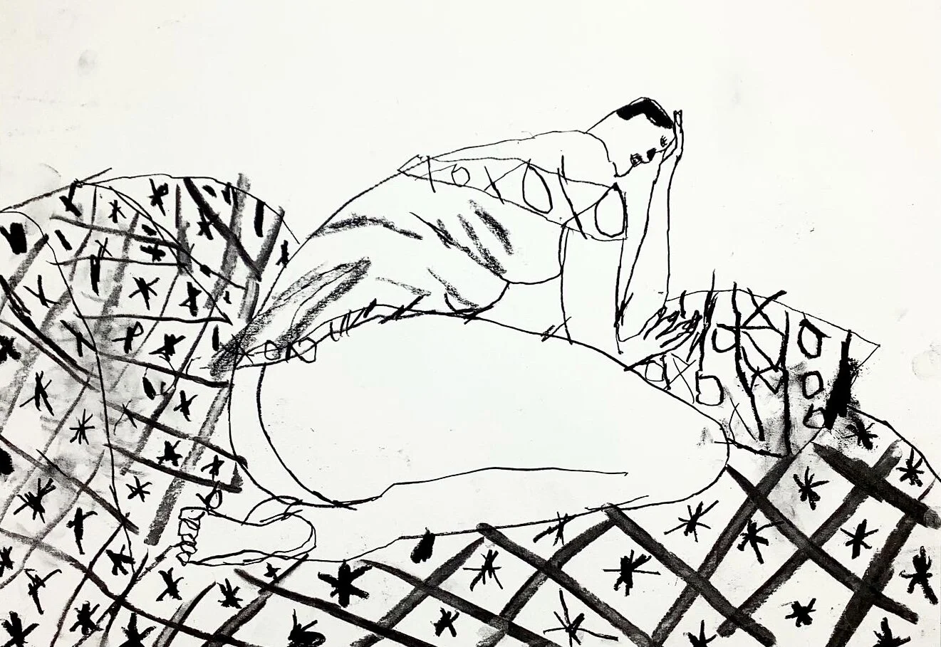 Life drawing on stripy sofa by artist Tracey Slater
