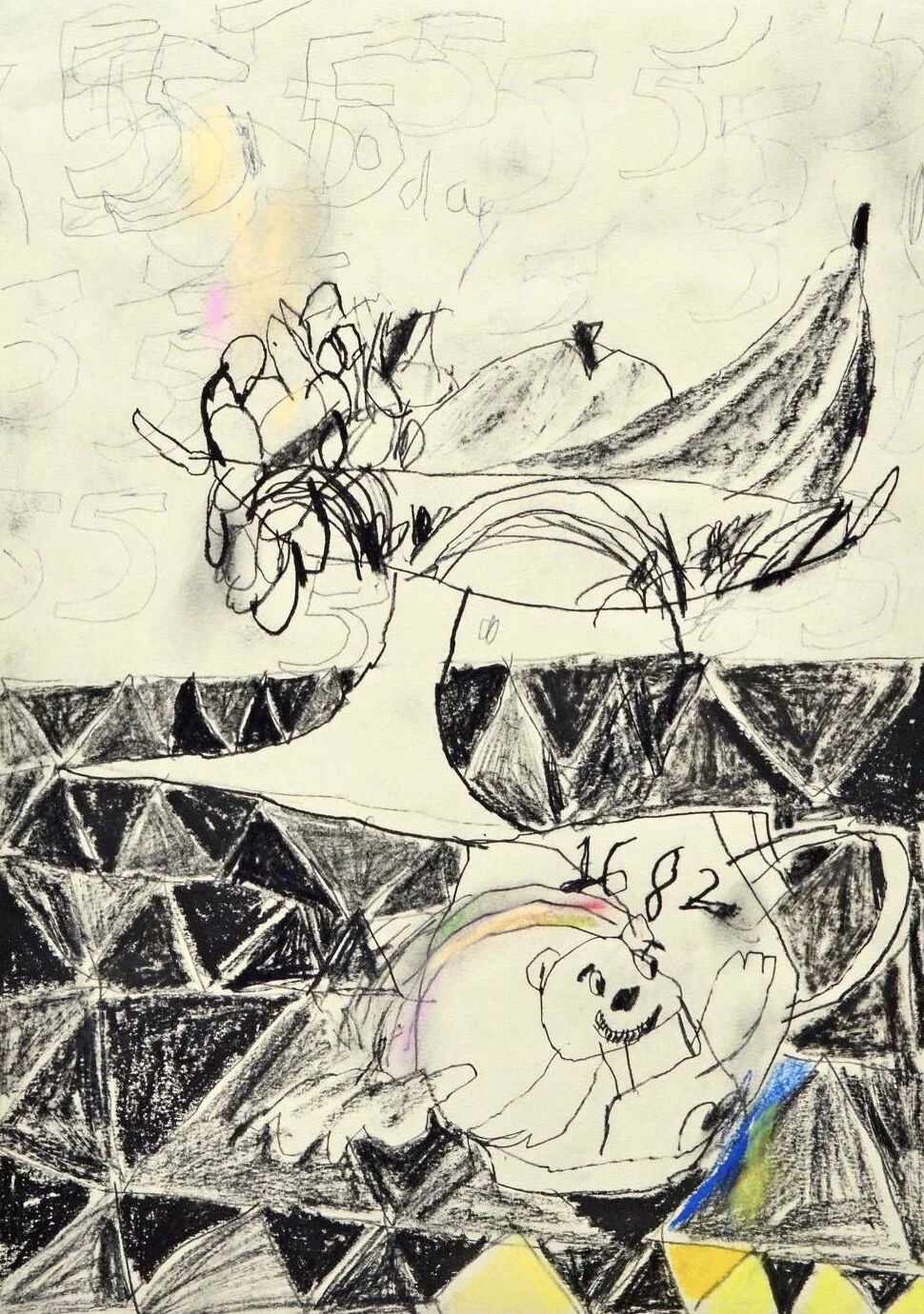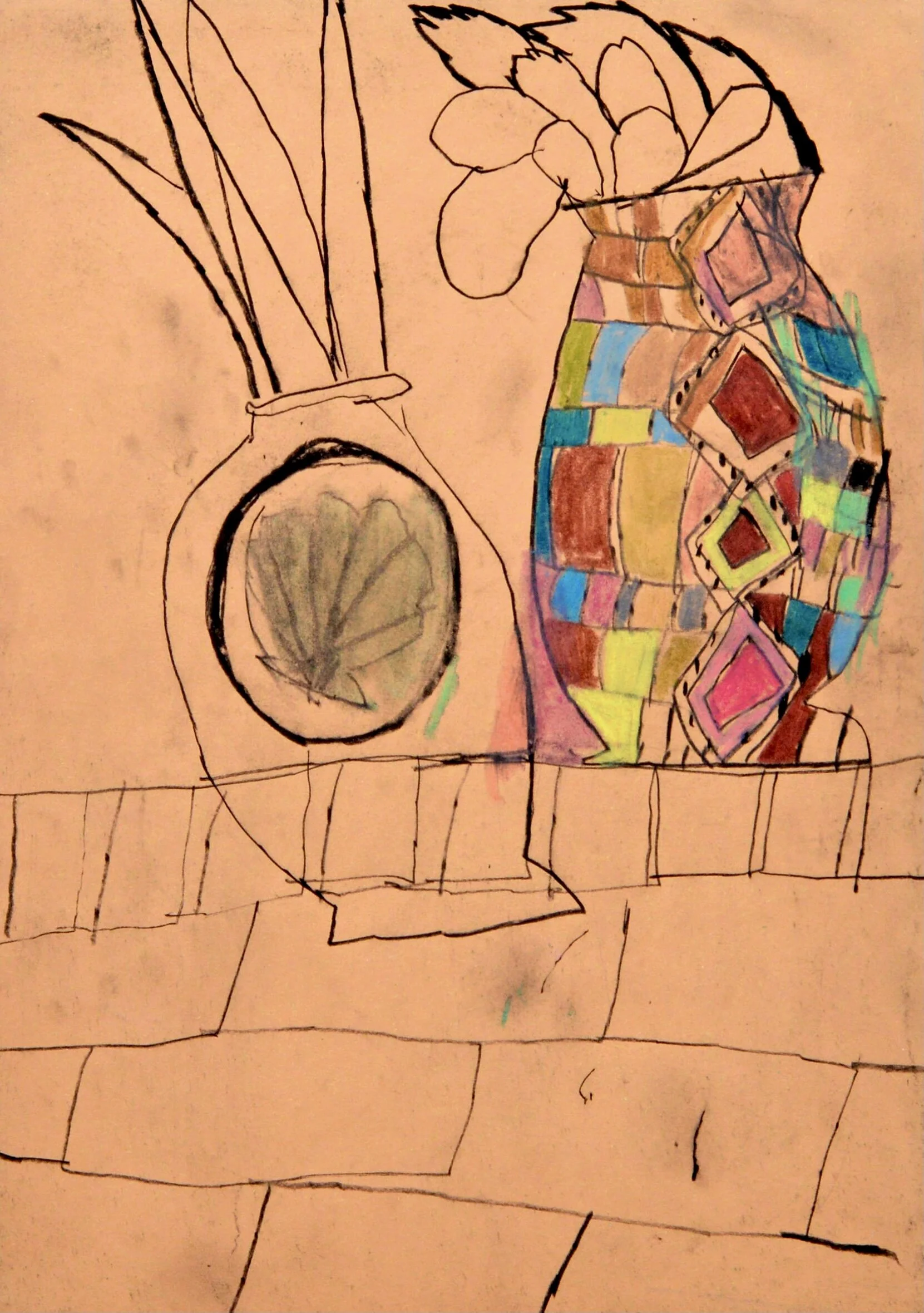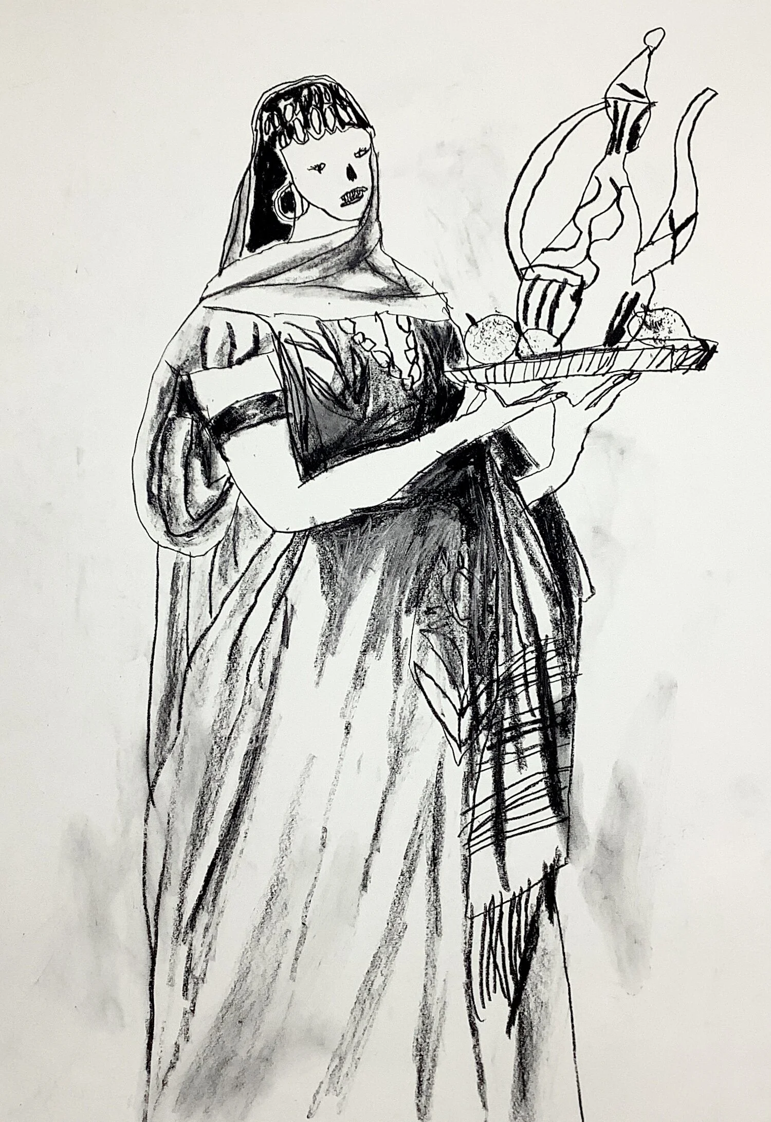 Art drawing of woman with fruit bowl and vase, Artist Tracey Slater