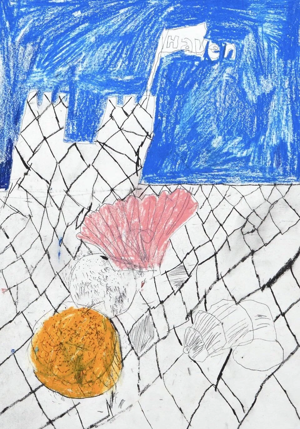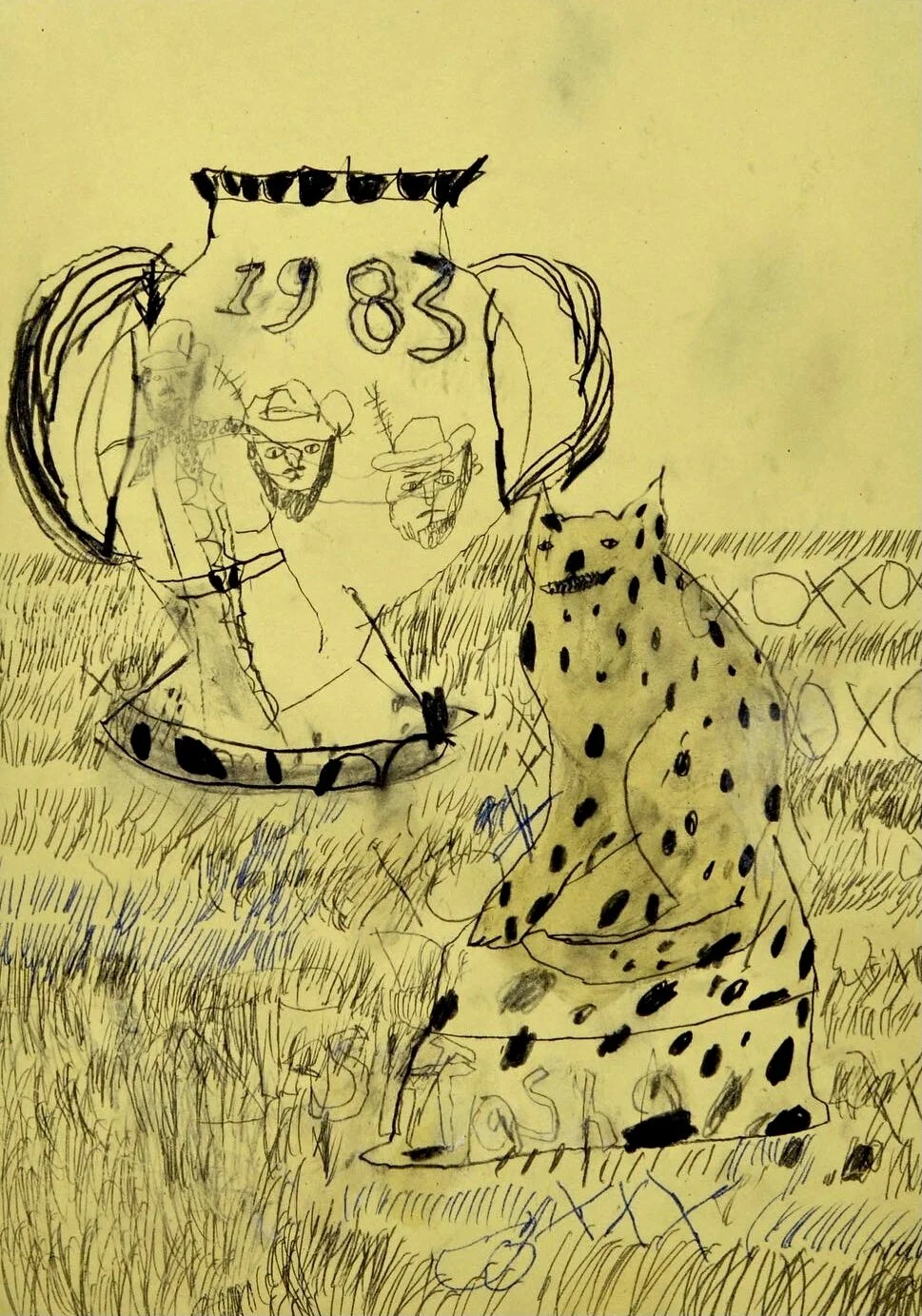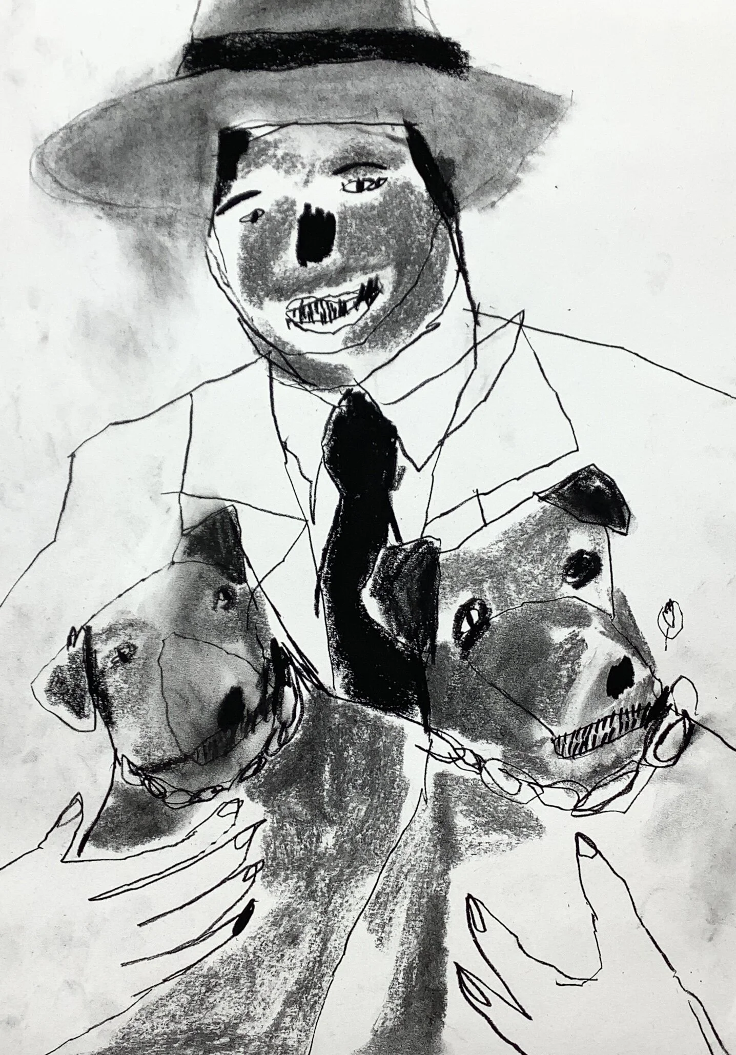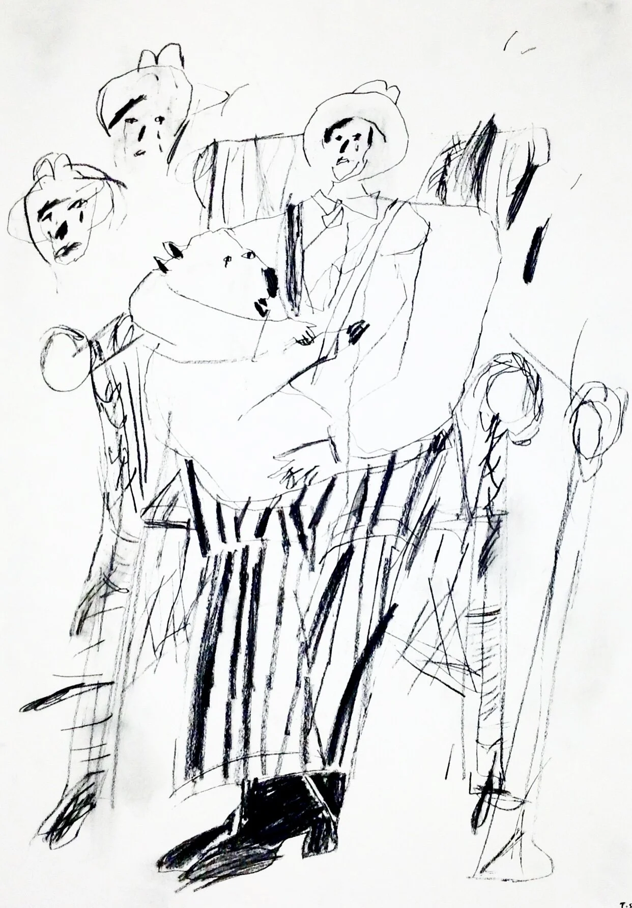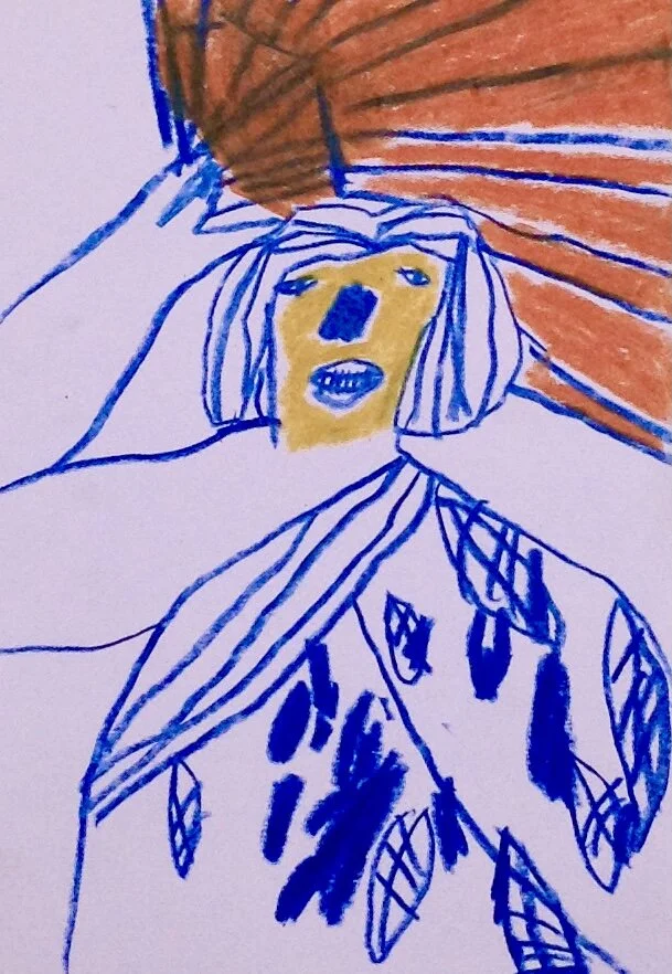 Kneeling male drawing with faces by Artist Tracey Slater