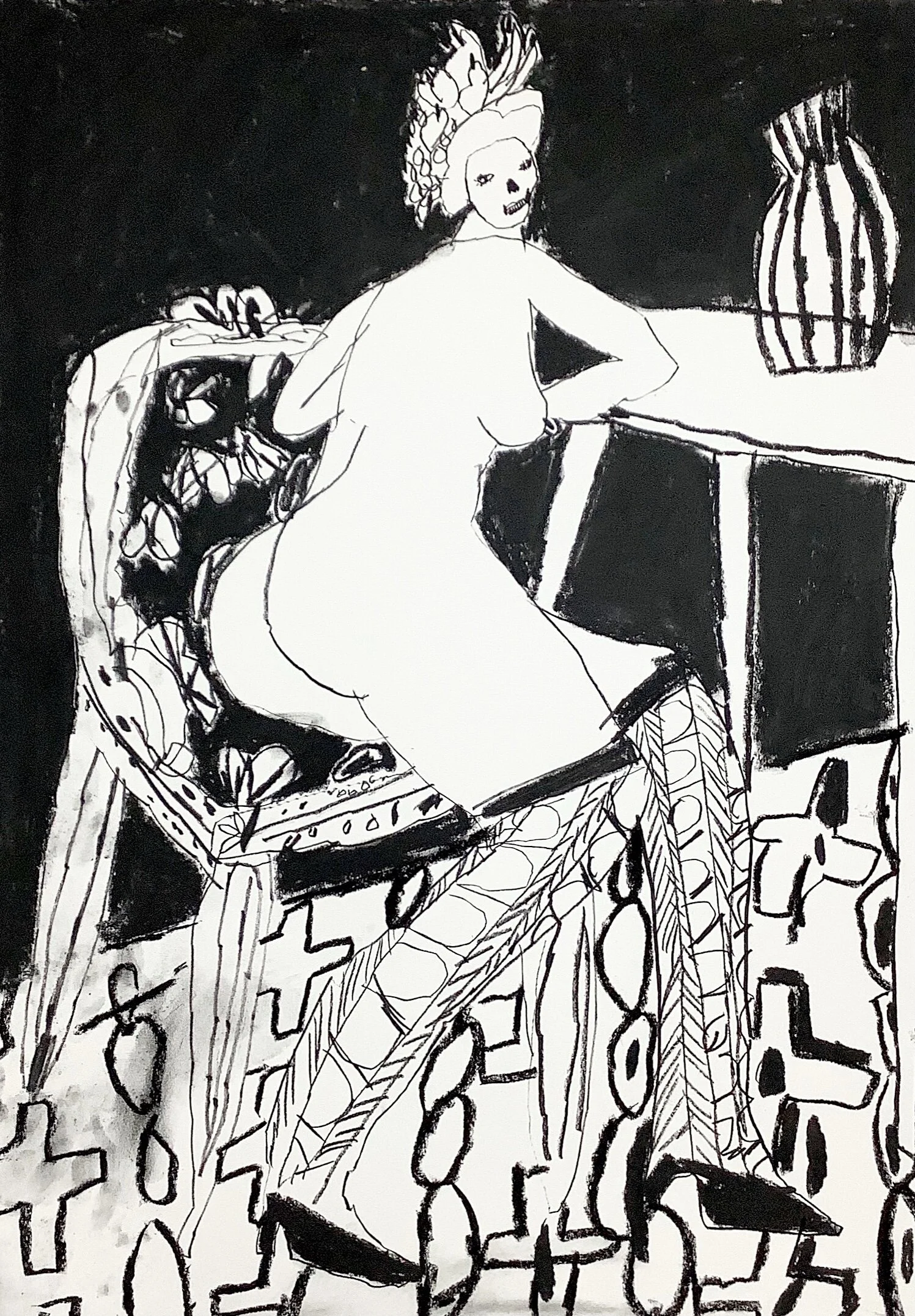 Nude woman life drawing on patterned chair by Artist Tracey Slater