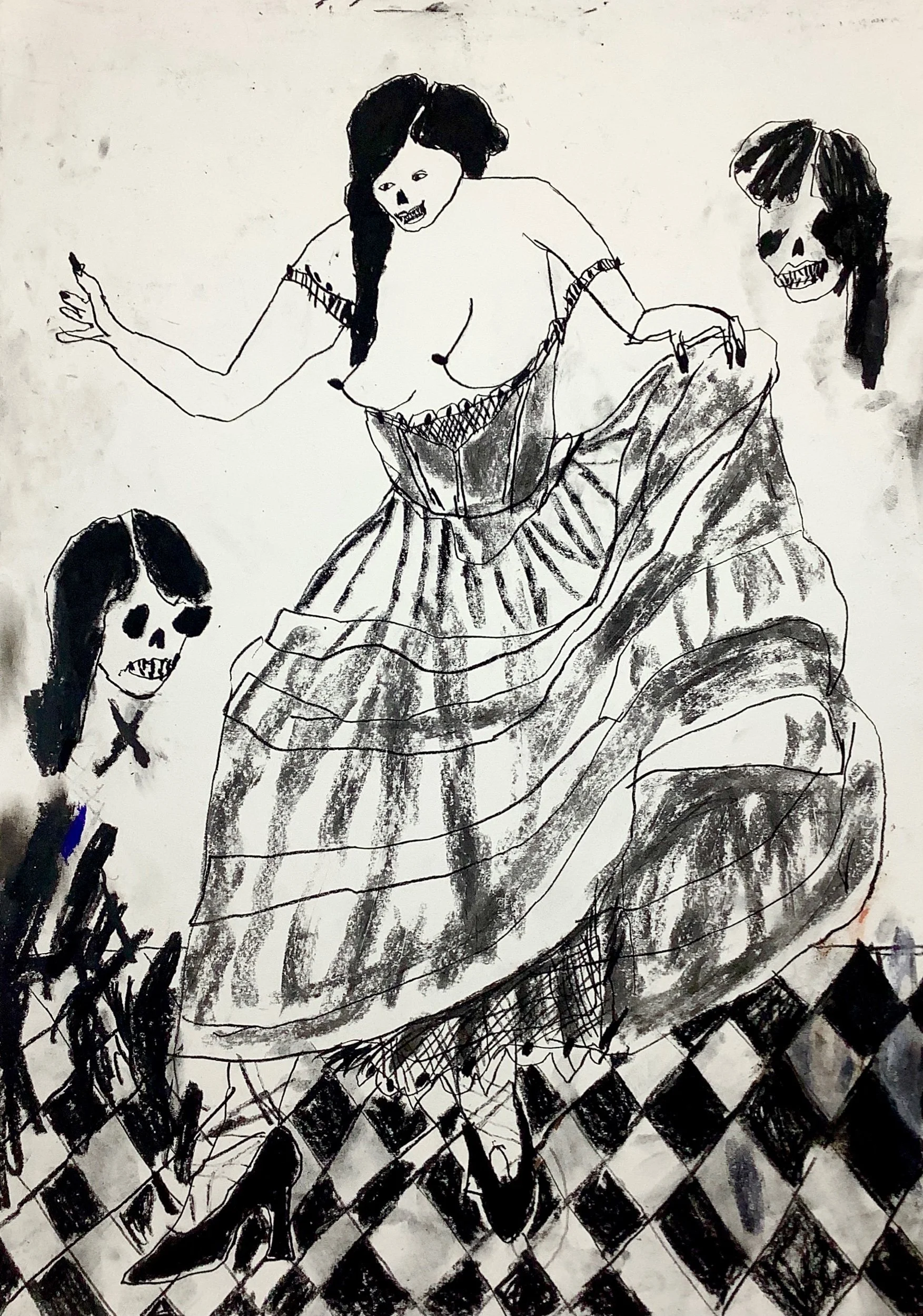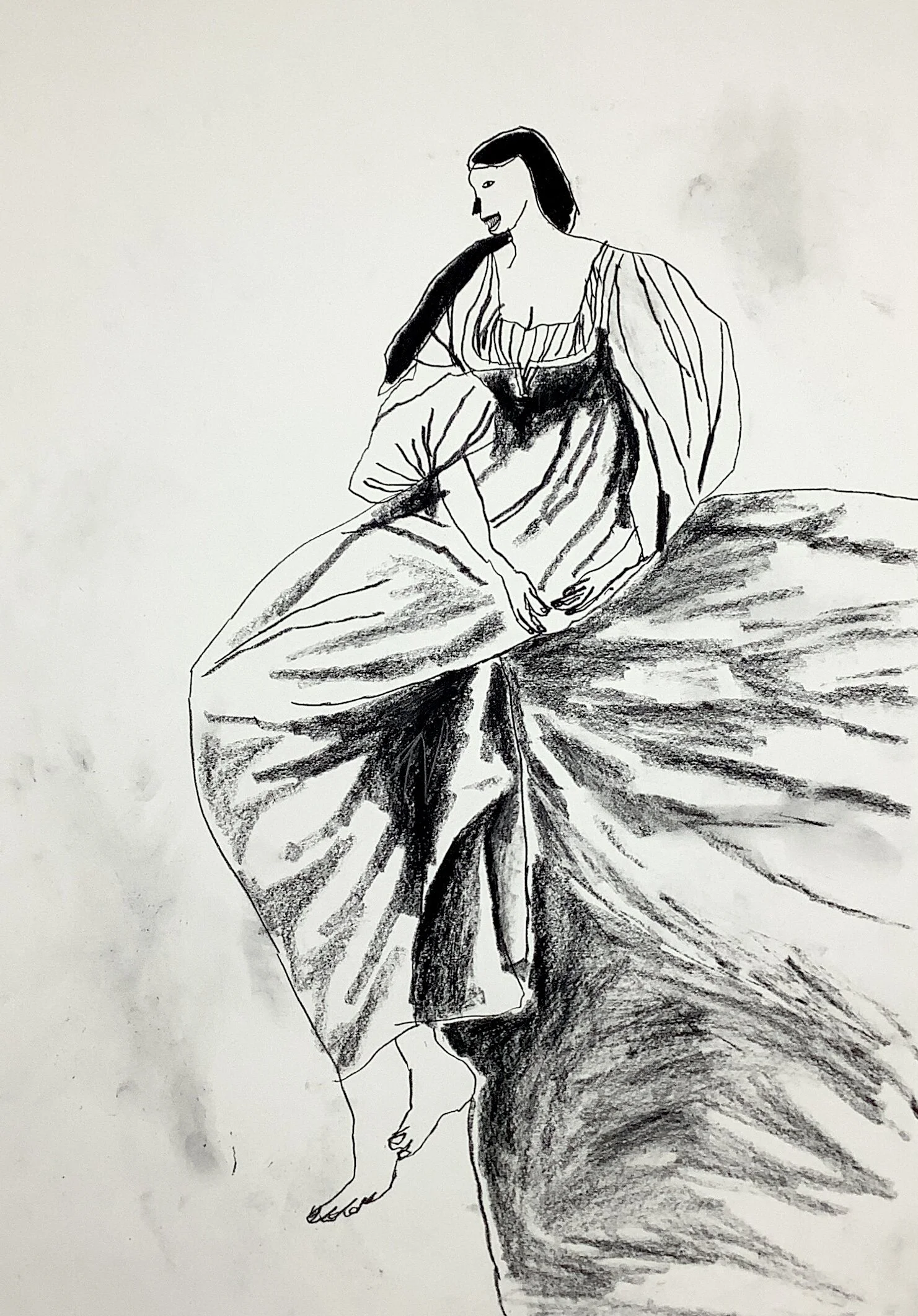 Period woman with long dress and faces drawing by artist Tracey Slater