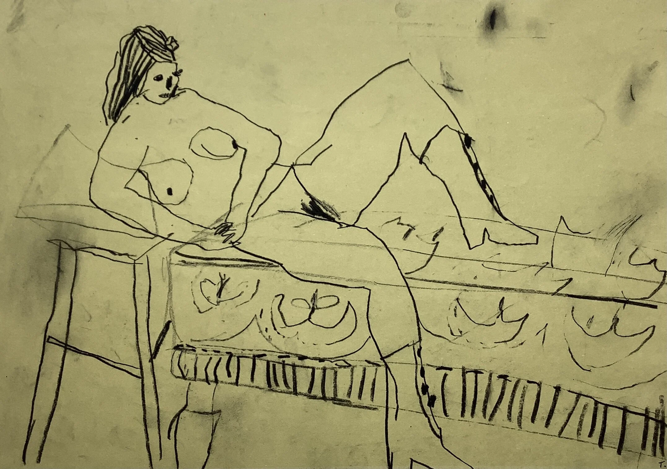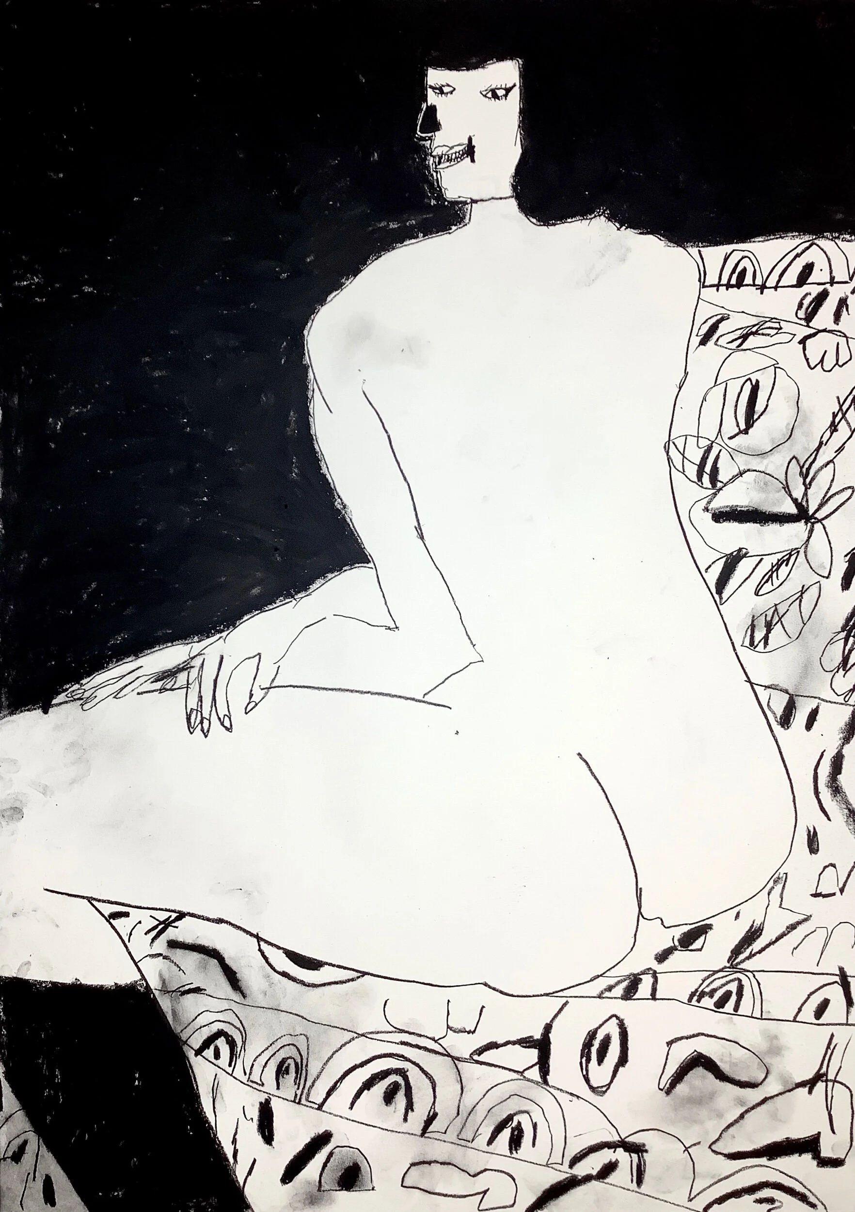 Life drawing on patterned sofa by artist Tracey slater