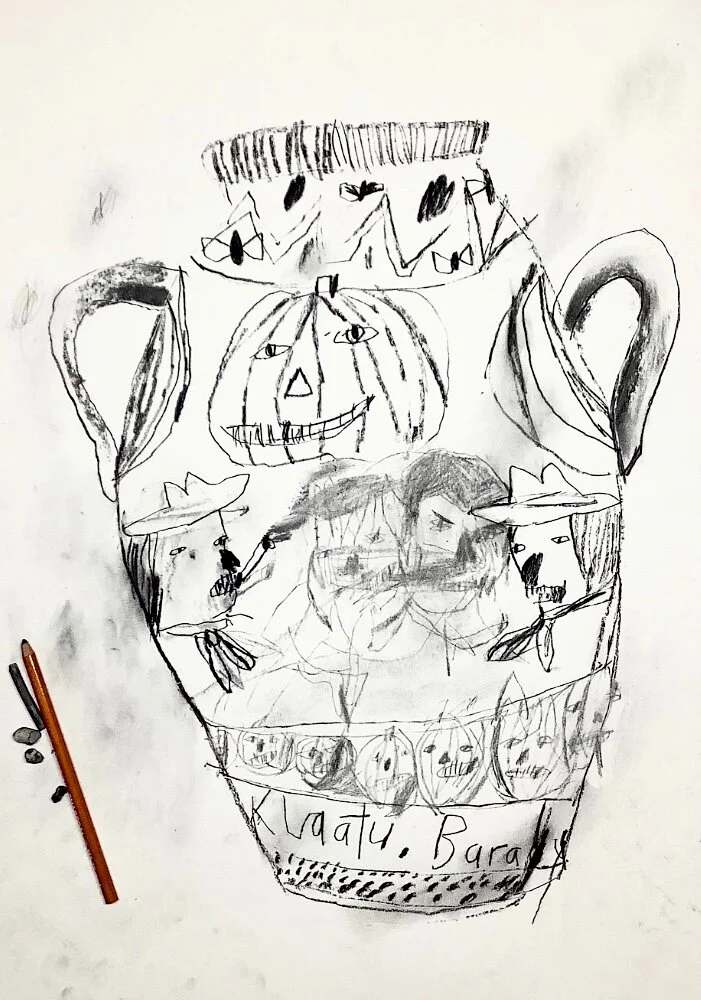 Contemporary charcoal drawing woman with vase on vintage rug by artist Tracey Slater