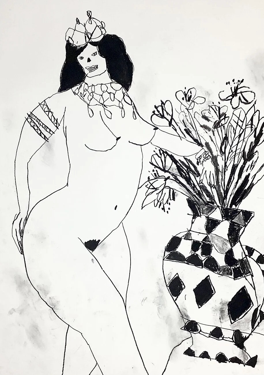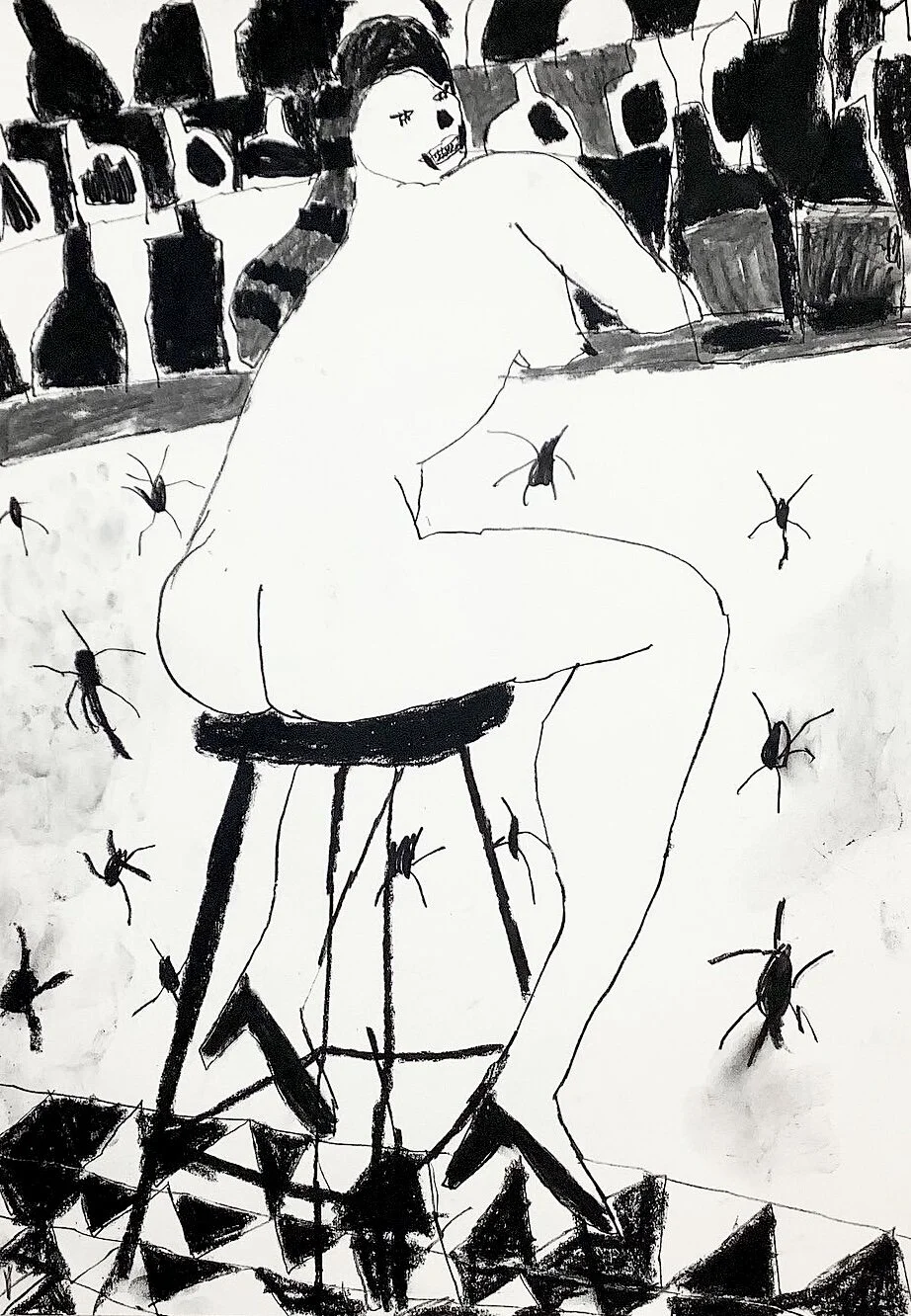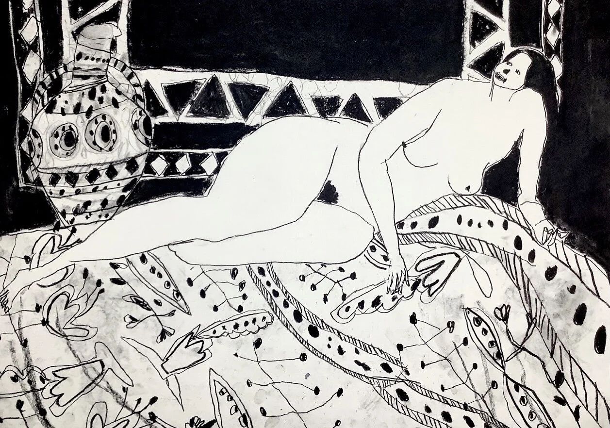 Large contemporary drawing of nude with wine by Artist Tracey Slater