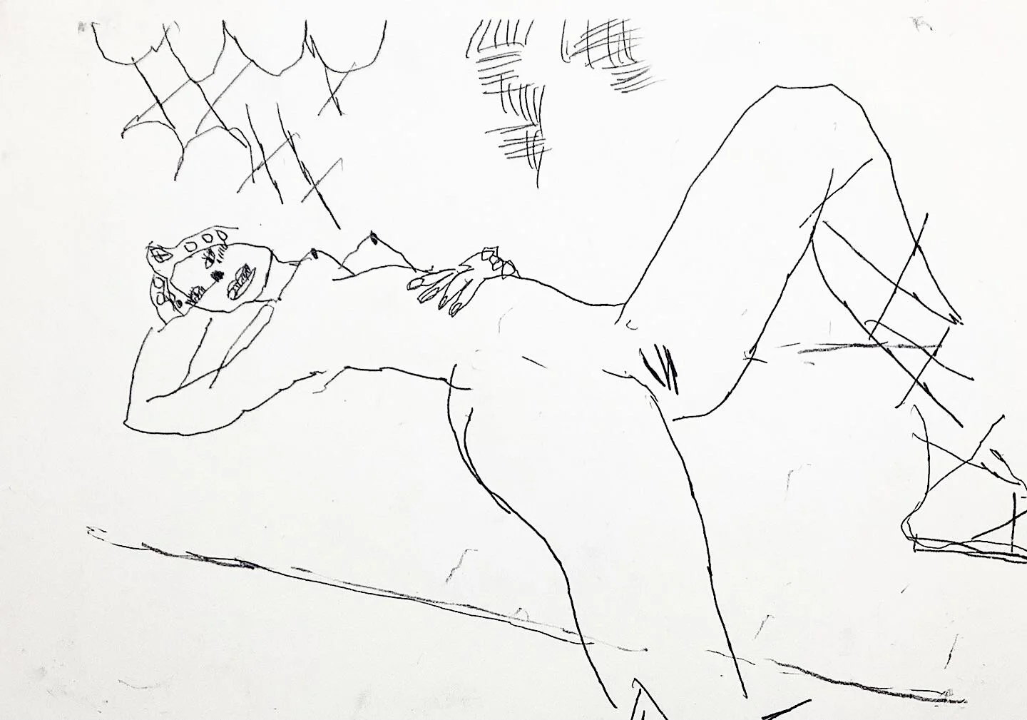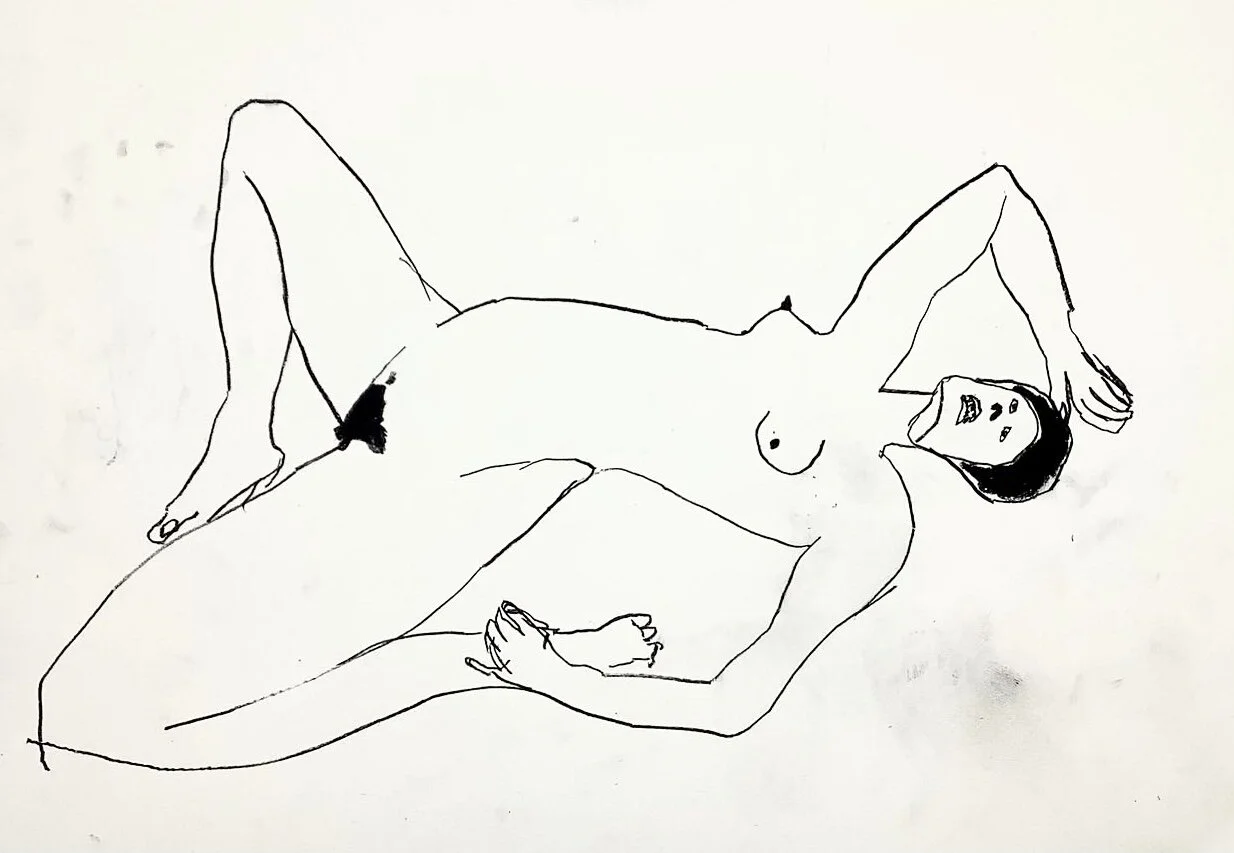 Contemporary figurative drawing nude lay8ng with candles and wine by artist Tracey Slater