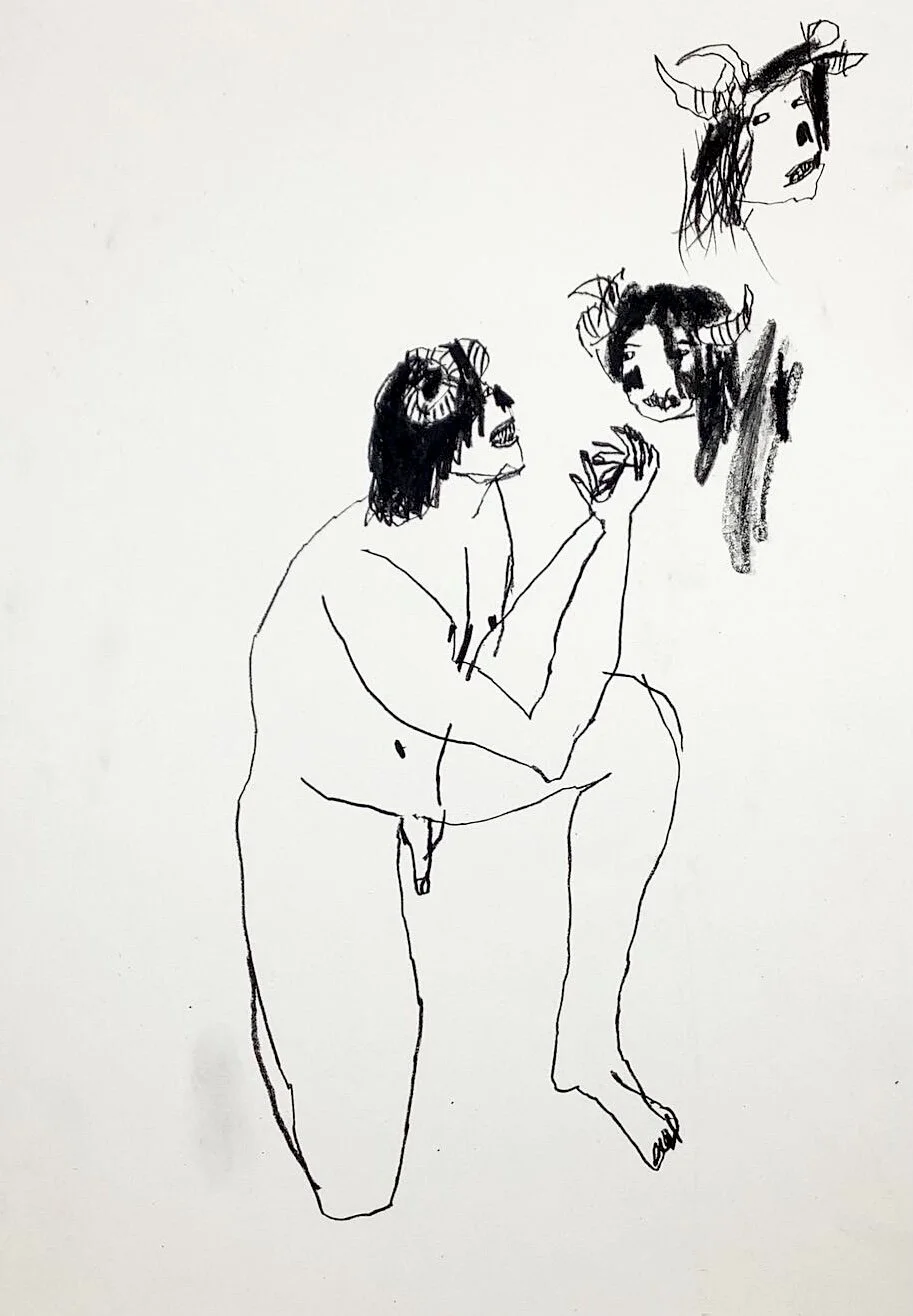 Minotaur Kneeling male figurative drawing by Artist Tracey Slater